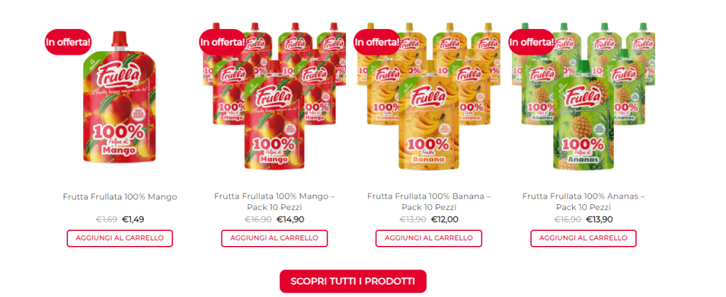 Su shop.frutta-frullata.com trovi una vasta selezione di prodotti a base di frutta frullata senza zuccheri aggiunti, coloranti o conservanti. L’ideale per chi cerca uno spuntino leggero, sano e veloce.