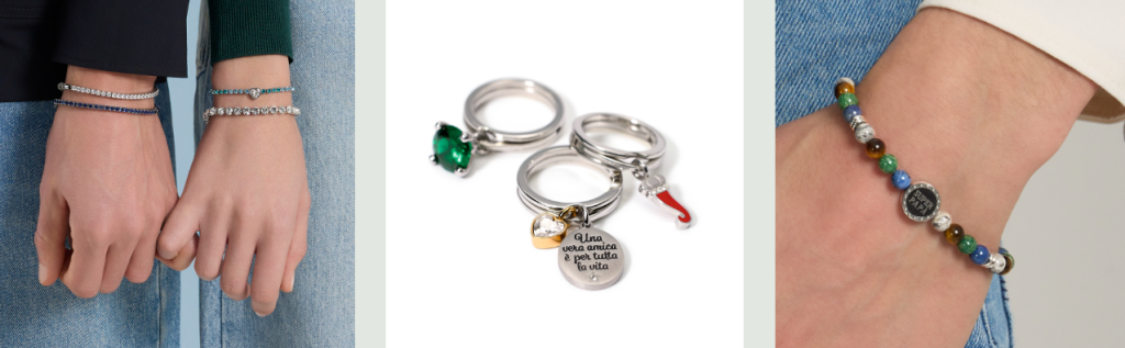 - Bracciali tematici per uomo e donna, realizzati in acciaio, con incisioni e simboli che rappresentano emozioni e momenti importanti.